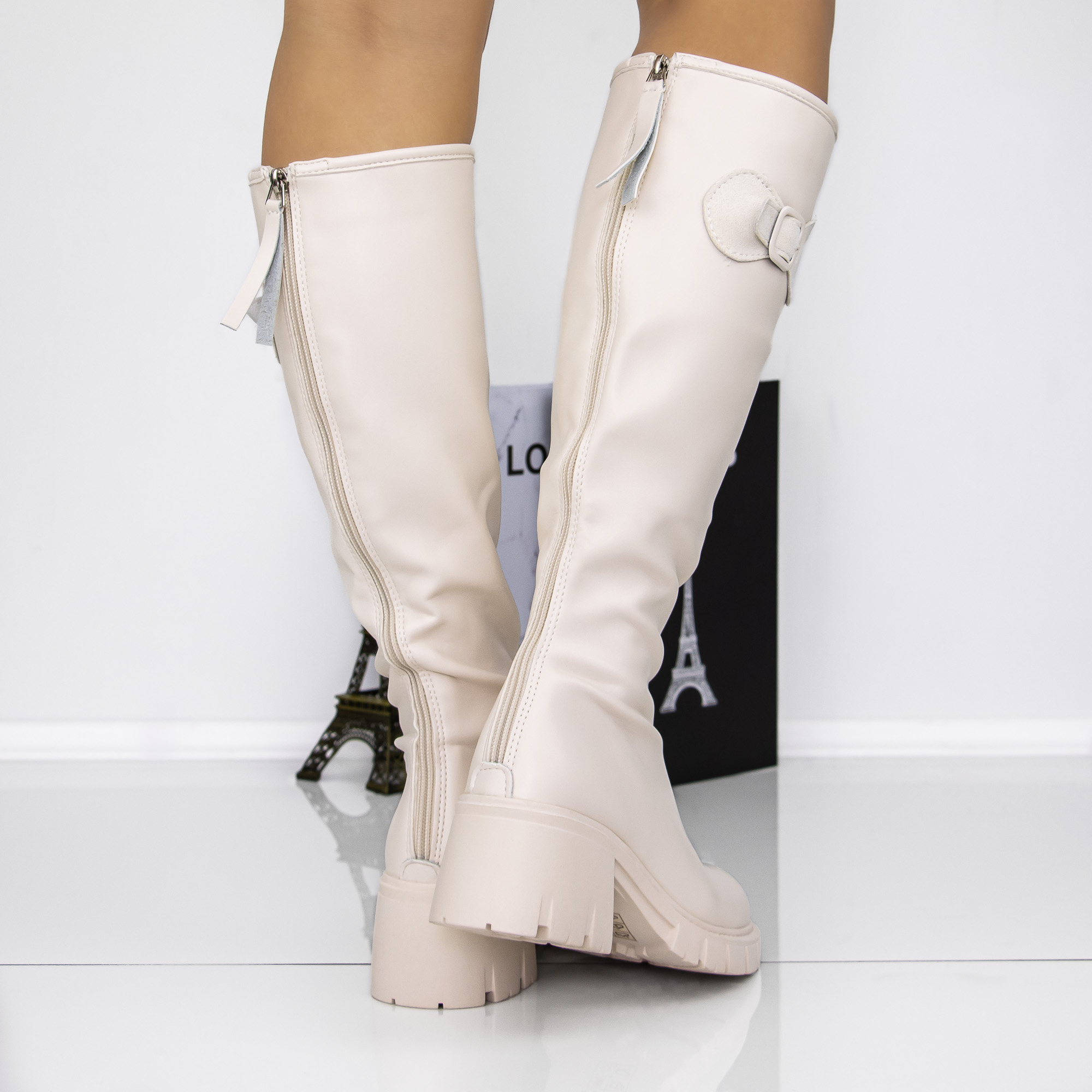 Cizme dama cu toc bej din piele ecologica Maysen - Detalii produs