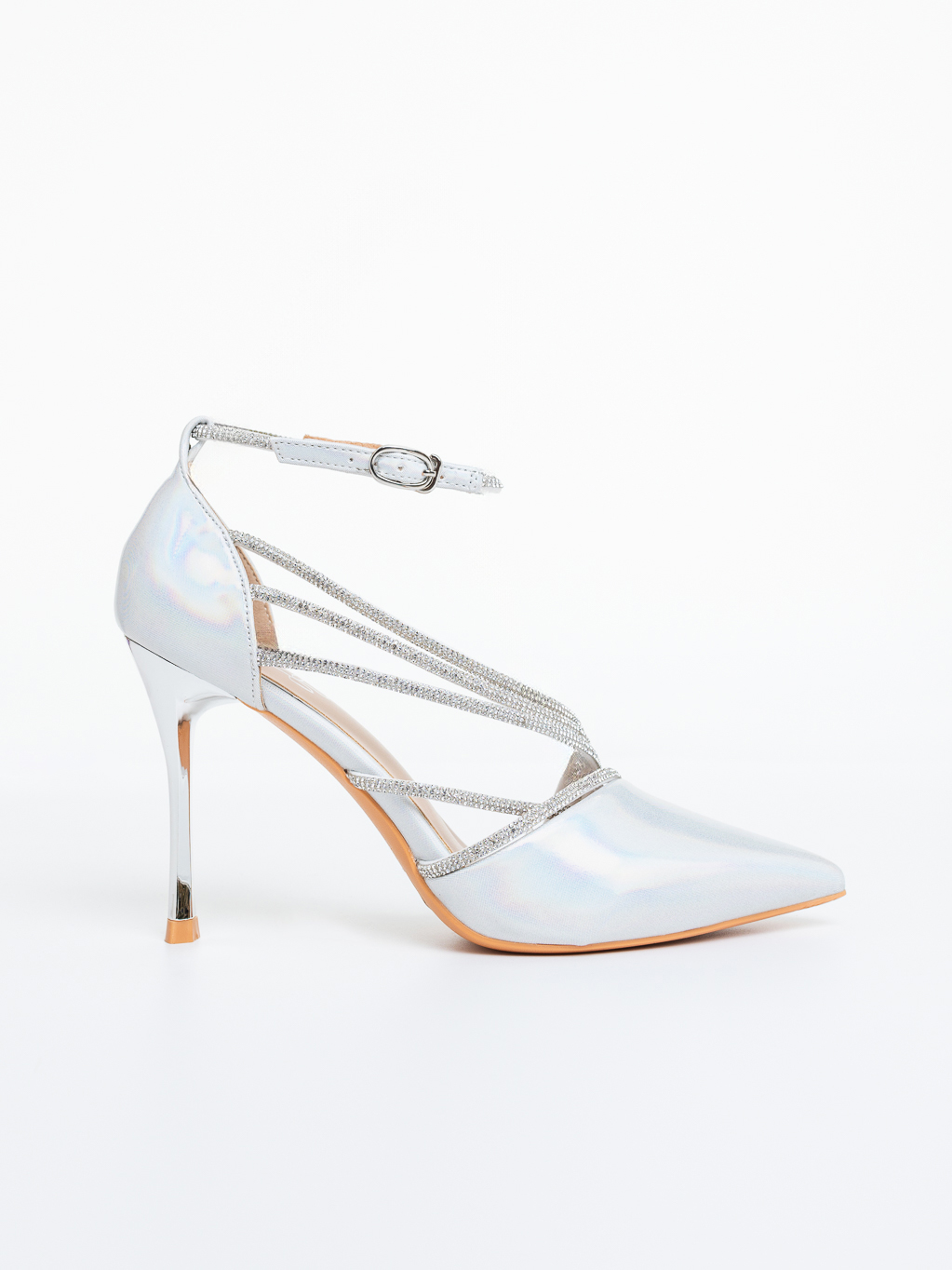 Pantofi dama cu toc argintii din material textil Mezmera - Detalii produs